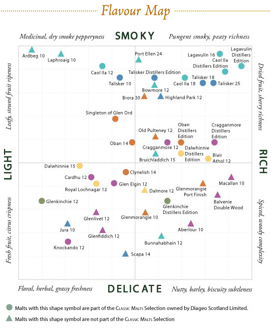 また、ポジションマークの表示方法にも改良が加えられている。●はクラシックモルト・シリーズで、▲はそれ以外だ。また産地による色分けもされてあり、青がアイランズ、水色がアイラ、茶色が東西沿岸域、肌色がハイランド、紫がスペイサイド、そしてモスグリーンがローランドとなっている。ちなみにインヴァネスよりも北にあり、スペイサイドよりも西に位置するクラインリッシュは、本来北ハイランドといった区域に分類されるべきだと思うのだが、ディアジオ社によれば「東海岸地域」となるようだ。