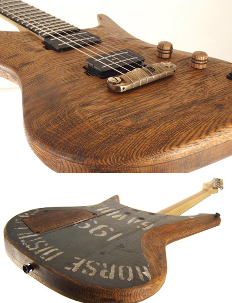 ウイスキー樽の廃材を利用したものは、家具や家屋の内装、文具などこれまでにもよくあったが、楽器に利用するというアイデアには正直唸った。しかも裏には、鏡板だったことを物語るステンシル文字が残されている点も洒落ている。