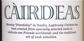 アイラ・フェスティバル向けのスペシャルボトリングについてのアナウンスが、ラフロイグ蒸留所から届いた。この限定ボトルには、『カーディス (CAIRDEAS)』という名が与えられたとのこと。“カーディス”とはゲール語で“友情”という意味で、もちろんこの蒸留所のオフィシャル会員制クラブ『フレンズ・オブ・ラフロイグ (Friends of Laphroaig)』になぞらえて命名されたものだ。ウェブサイトでは、すでに販売を始めている。