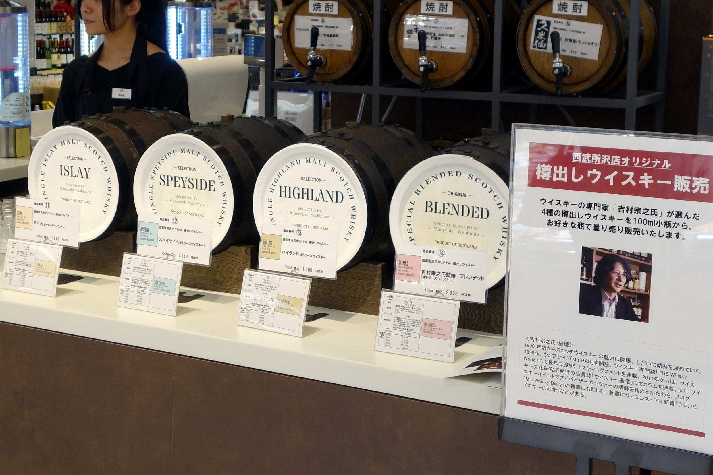去る5月26日、西武所沢店の地下1階の「酒蔵」に、M's Tasting Room と同様の「ウイスキー量り売り」のコーナーを開設した。樽はブレンデッド、スペイサイド、ハイランド、アイラの4種類で、ブレンデッドは私が調合した西武所沢店のオリジナルウイスキーだ。ブレンデッド以外の3樽はシングルモルトだが、蒸留所の素性はやむなき事情でシークレットとさせていただいている。